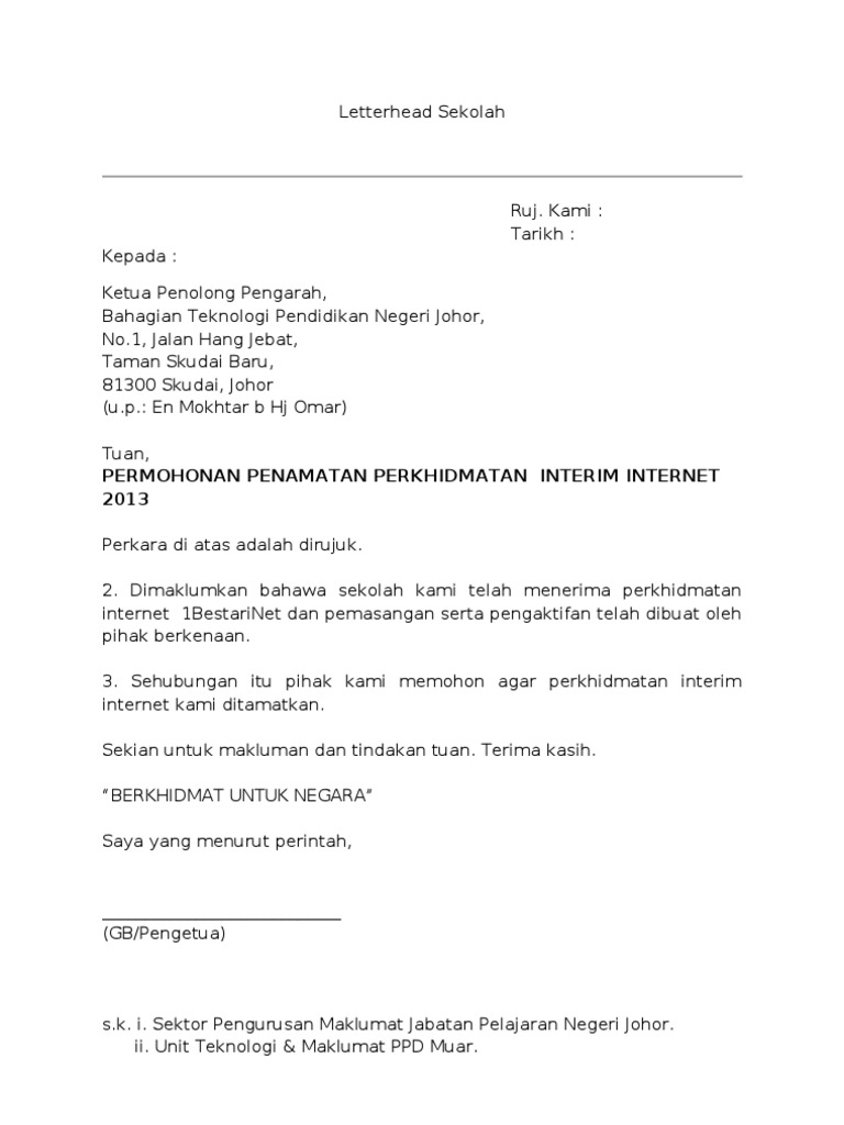 Contoh Surat Penamatan Perkhidmatan Internet